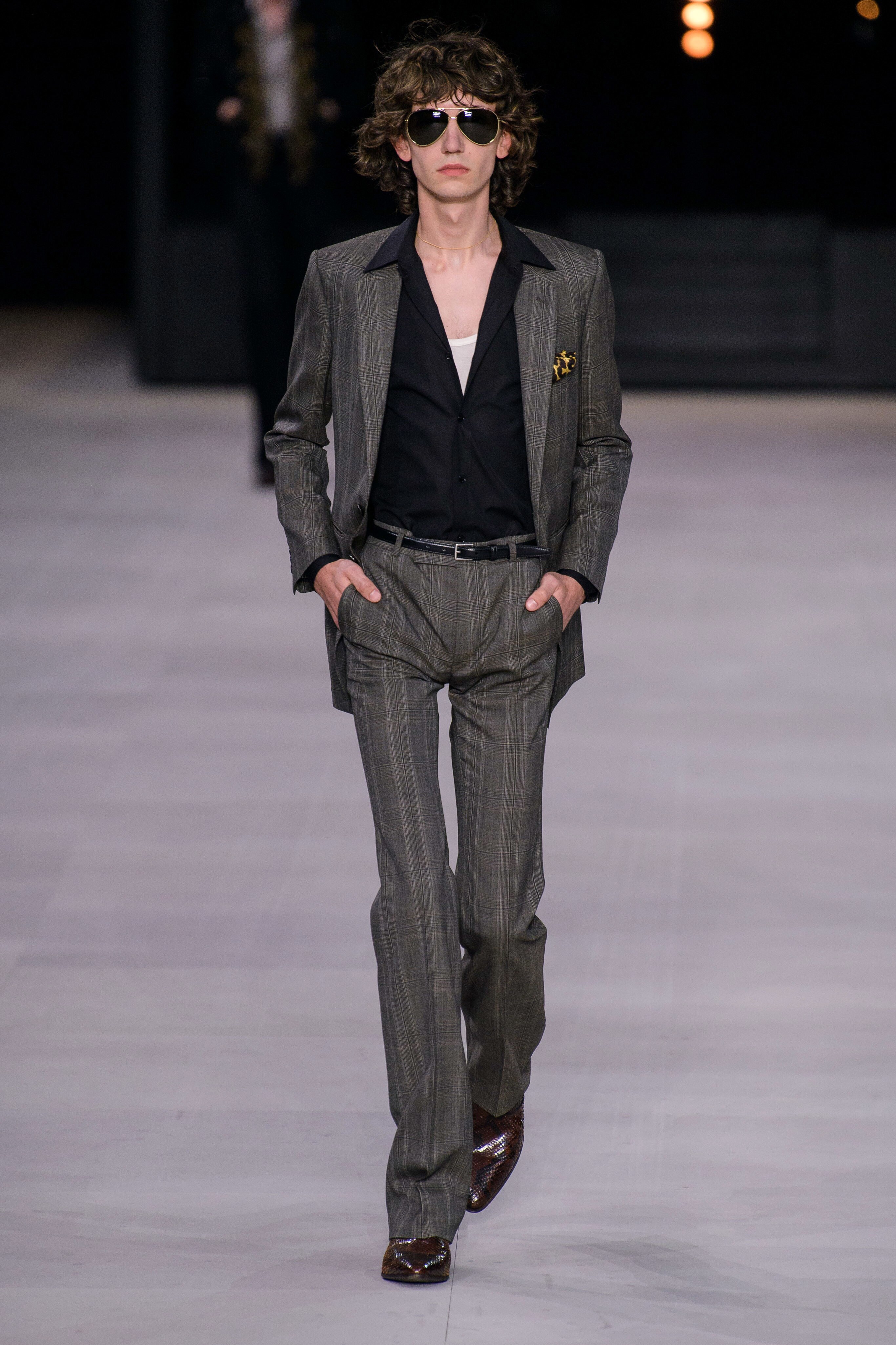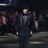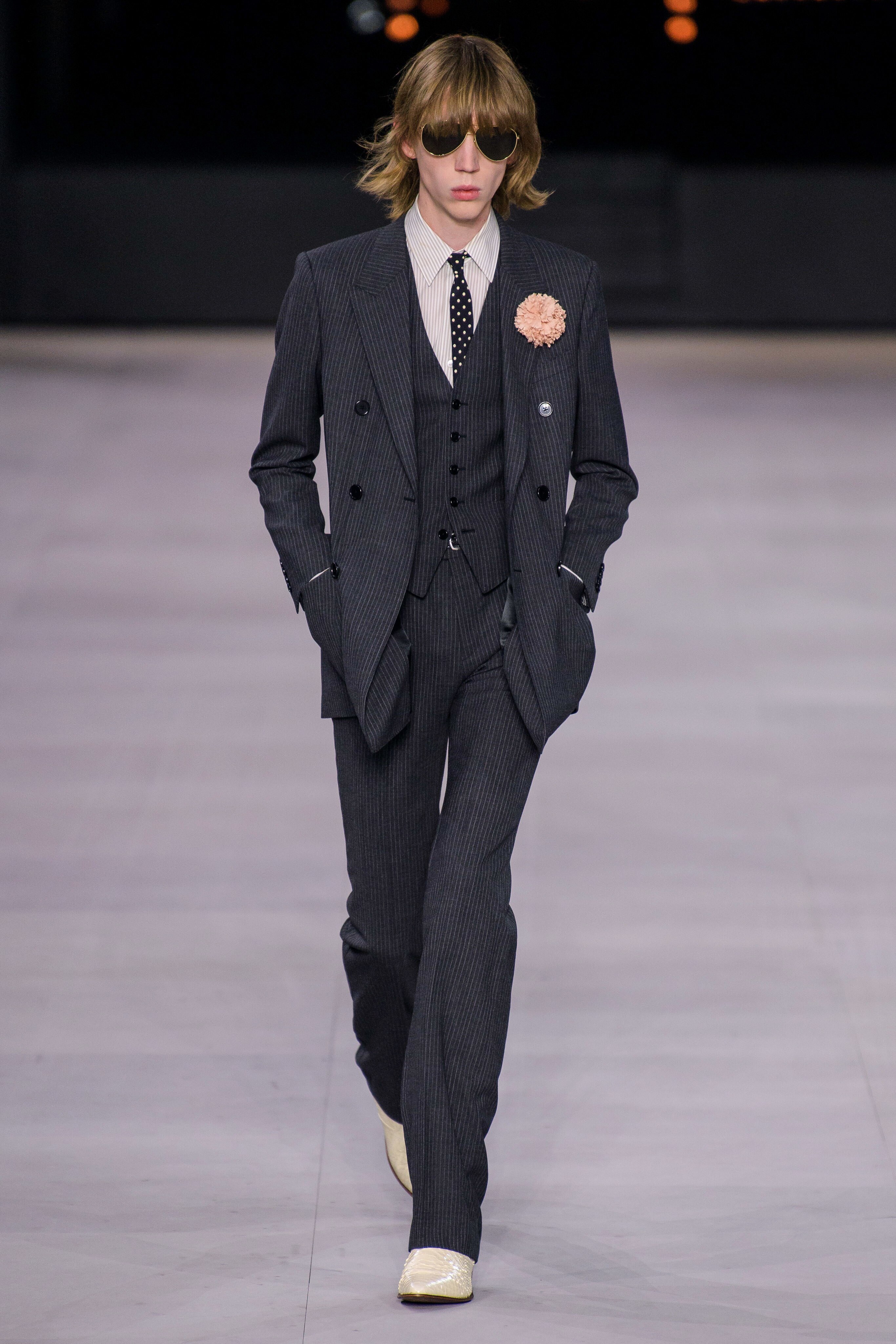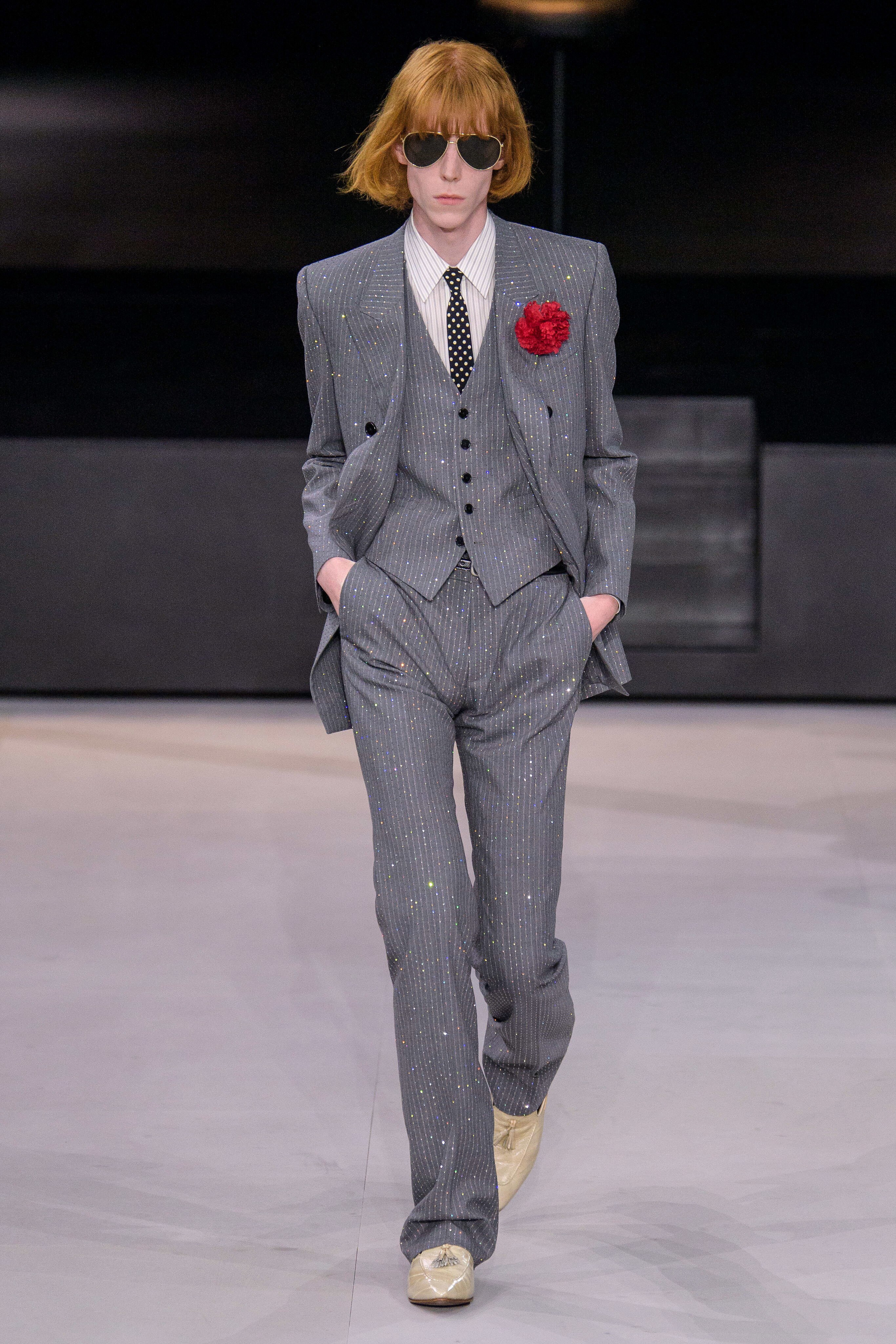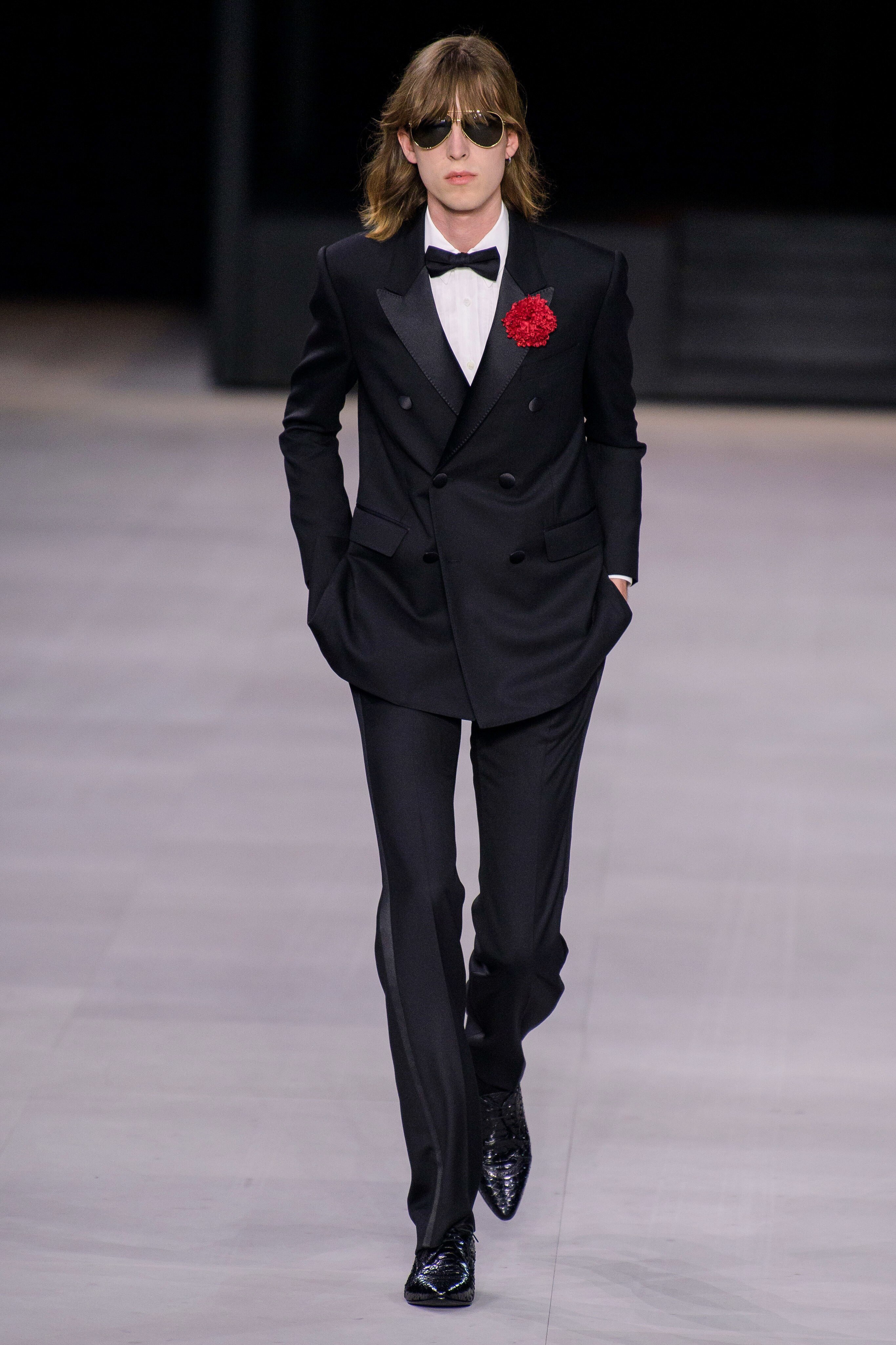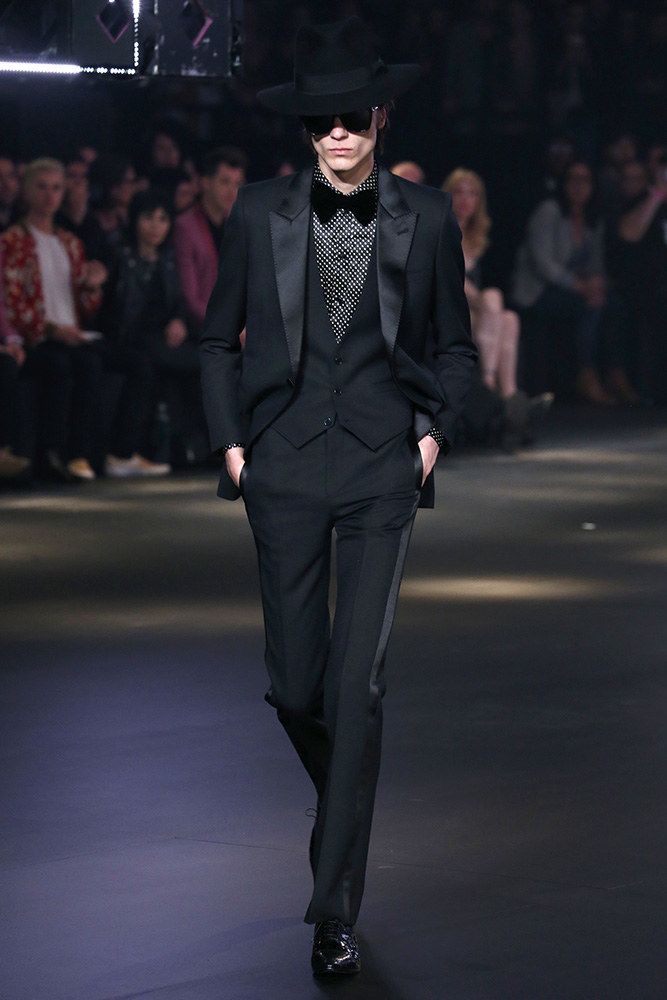 アンヴァリッドが最高に似合う金ボタンのナポレオンコート。フリルのシャツには蝶ネクタイを合わせ、ベルベットのパンツで更に上品に。CELINEに就任した後も作り続けているスモーキングは、Yves Saint Laurentへのオマージュが残っているからでしょうか。ブリティッシュの雰囲気を持つガンクラブ柄のコート。ベルテットやエポレットなどのディテールは英国を代表するトレンチコートと共通しています。こちらはかなりウィメンズのスタイルに振り切ったルック。けれども、女装しているようには思わせない。もしかして、この人アンドロジニーなのかも、?と思わせる絶妙なバランス感。テーラードといえばブリティッシュ。Hediのテーラードの肩のラインは、常にブリティッシュを象徴するコンケープド(肩先にかけて上がり、お堅い印象を与えるシルエット)になっています。デニムジャケットは、LAのグランジにはかかせない1着。スタッズをつけることで、さらにロックスターな気分に。キラキラと輝くそのスーツは、まさにロックスターそのもの。ボウタイブラウスを合わせることで、ジェンダレスを唱う現代のロックスタースタイルに。ブーツのヒールは80mm。Saint Laurent 2015awのような高さで、ほとんどウィメンズに近いシルエットになっています。ブーツは、クラシックなカーフスキンやスエードから、ロックなシルバー、ゴールド、パイソン柄など様々。スキニーなスカーフは、Dior時代から作り続けているHediの定番。ウィメンズのようなナイーブな雰囲気を出す、彼のスタイルにはかかせないアイテムです。今季は、メンズのバッグとしてショルダーバッグを提案。長年女性のものとされてきていたものを、今は男性が持つ時代なのです。