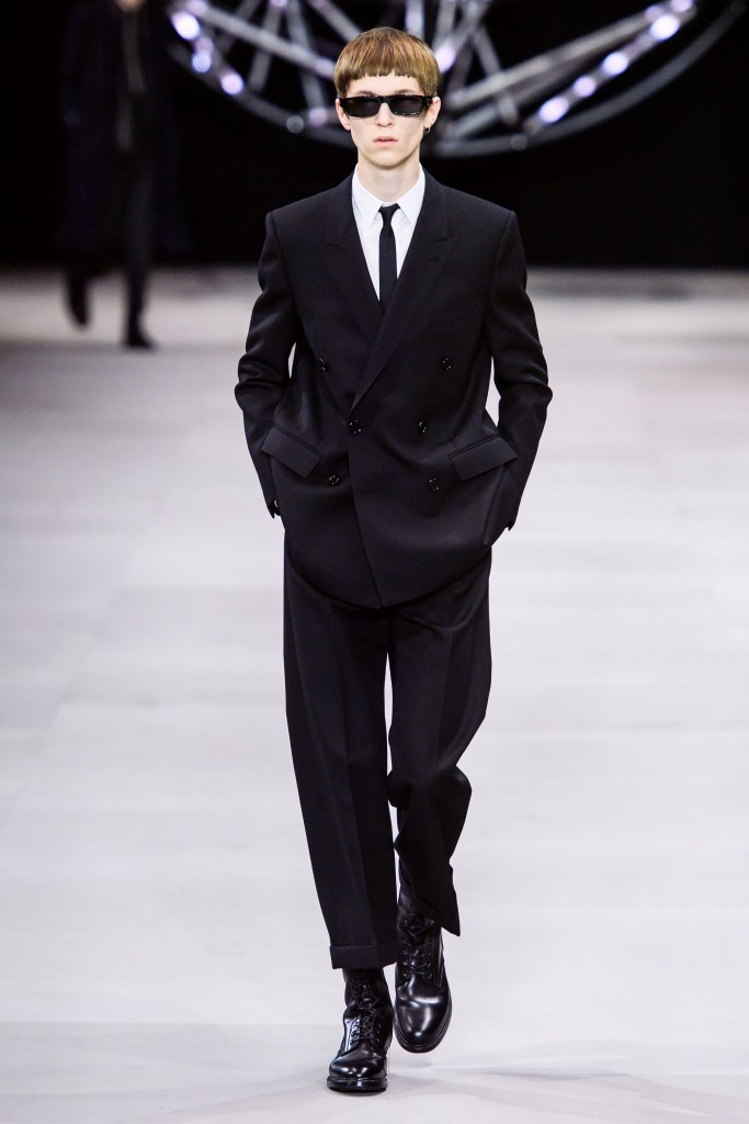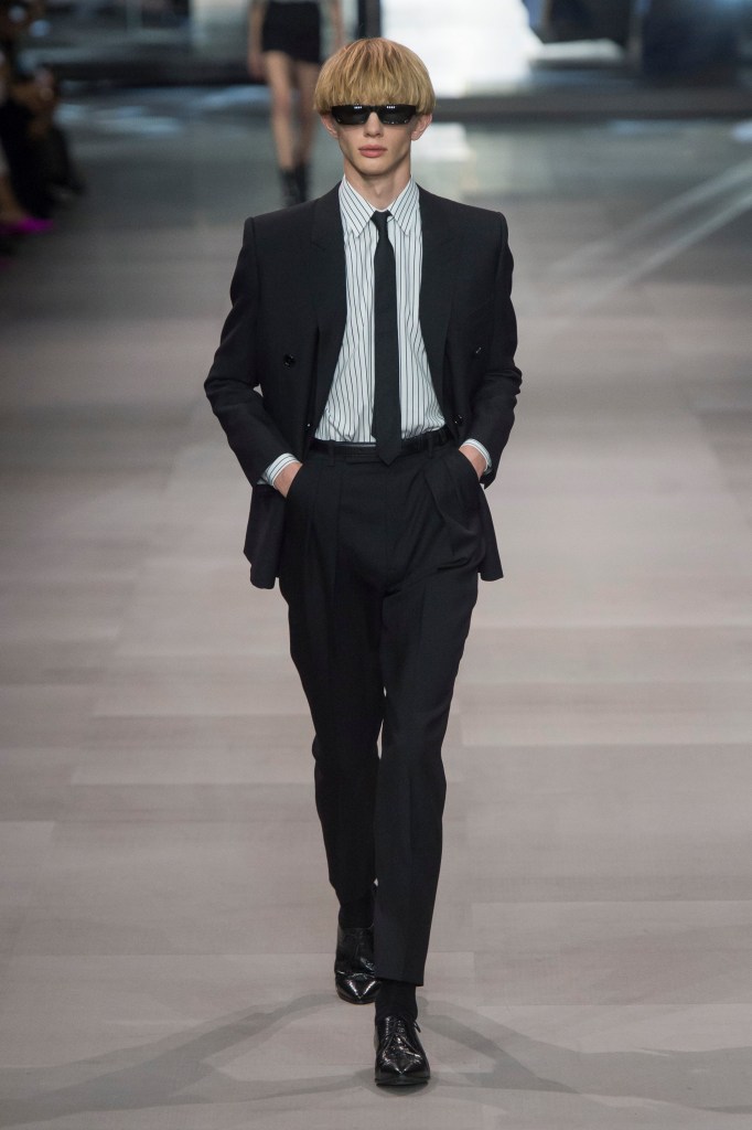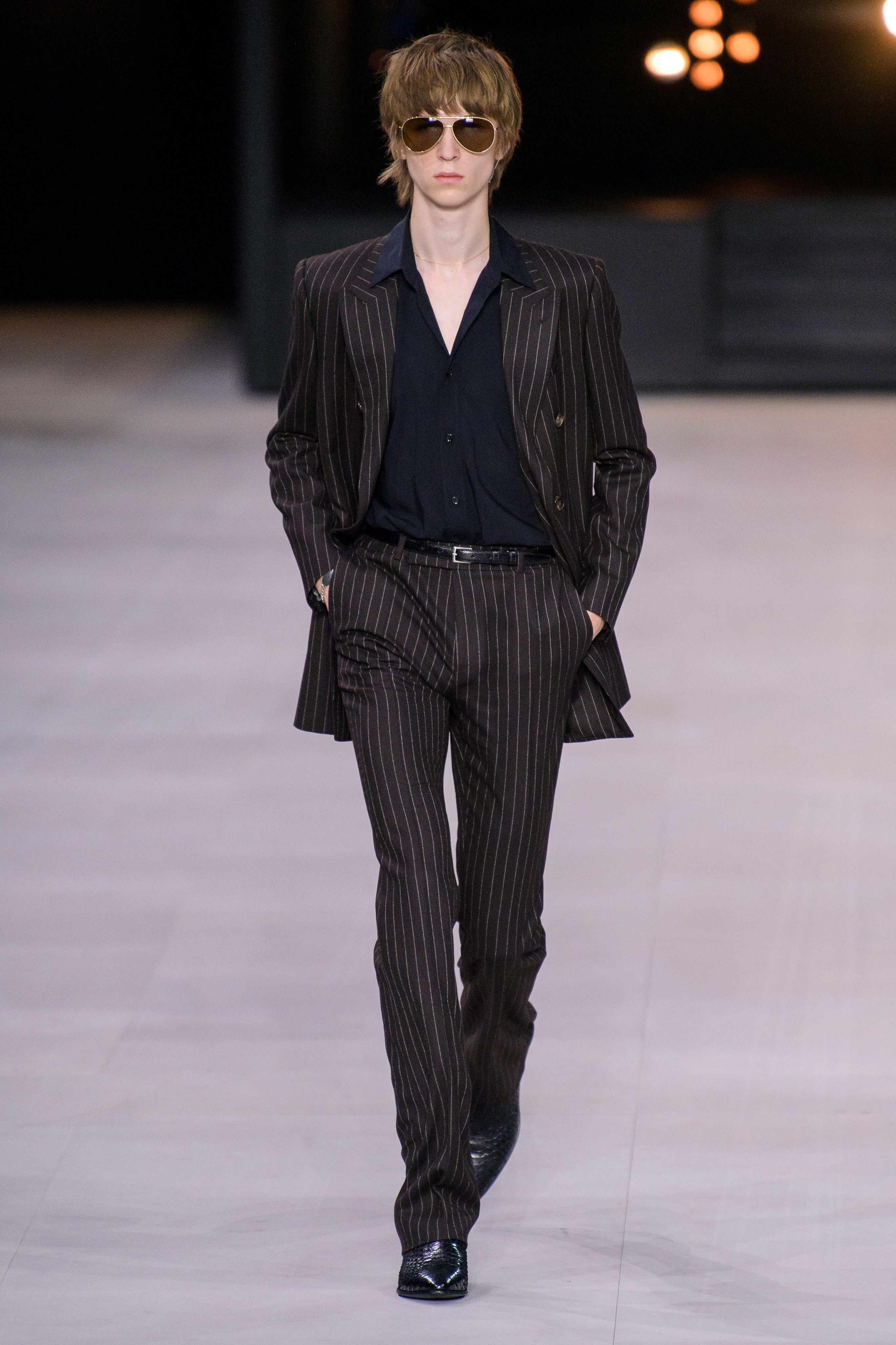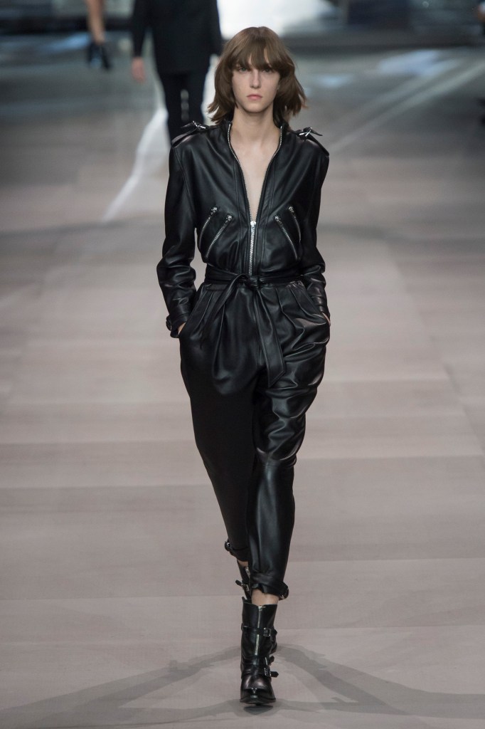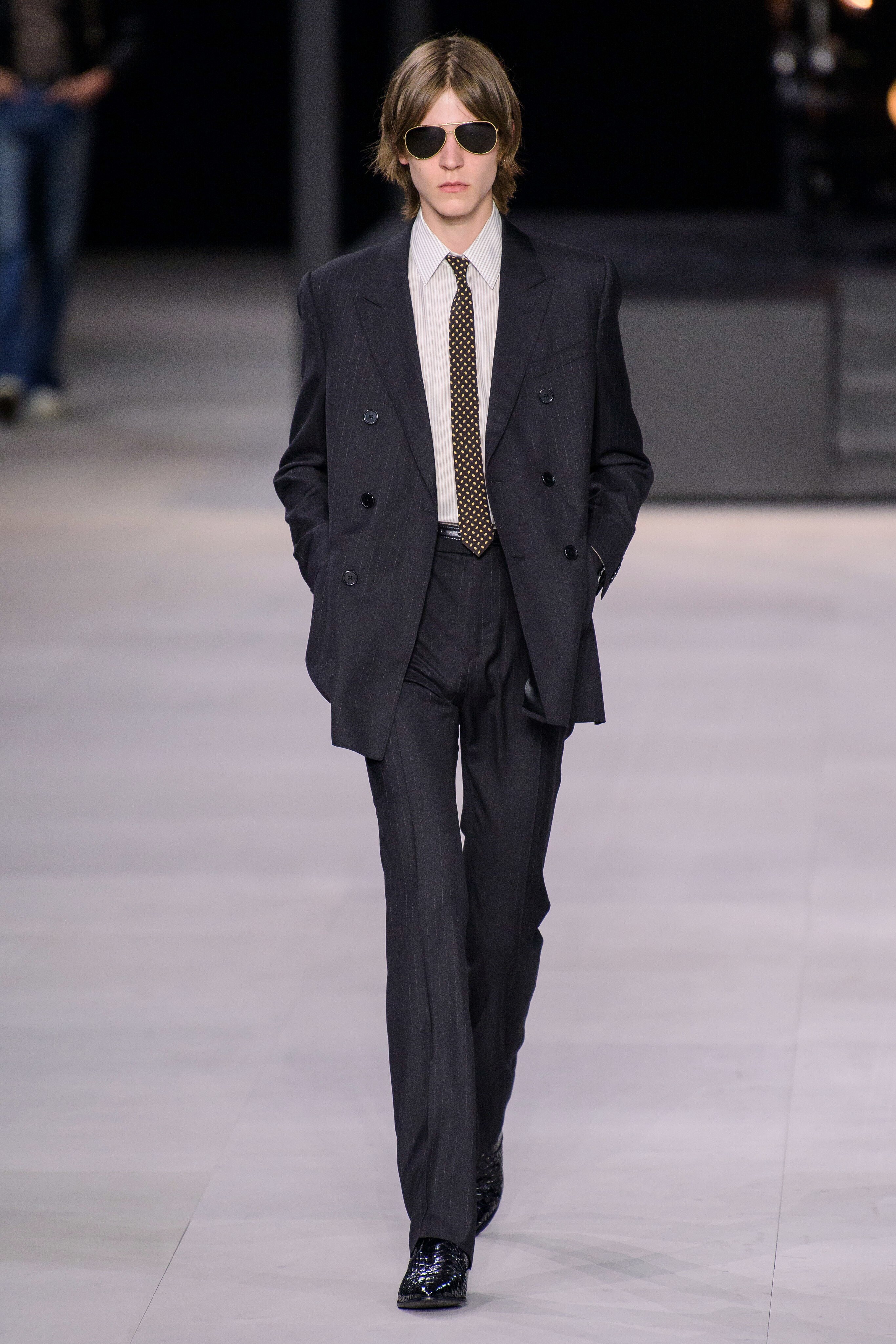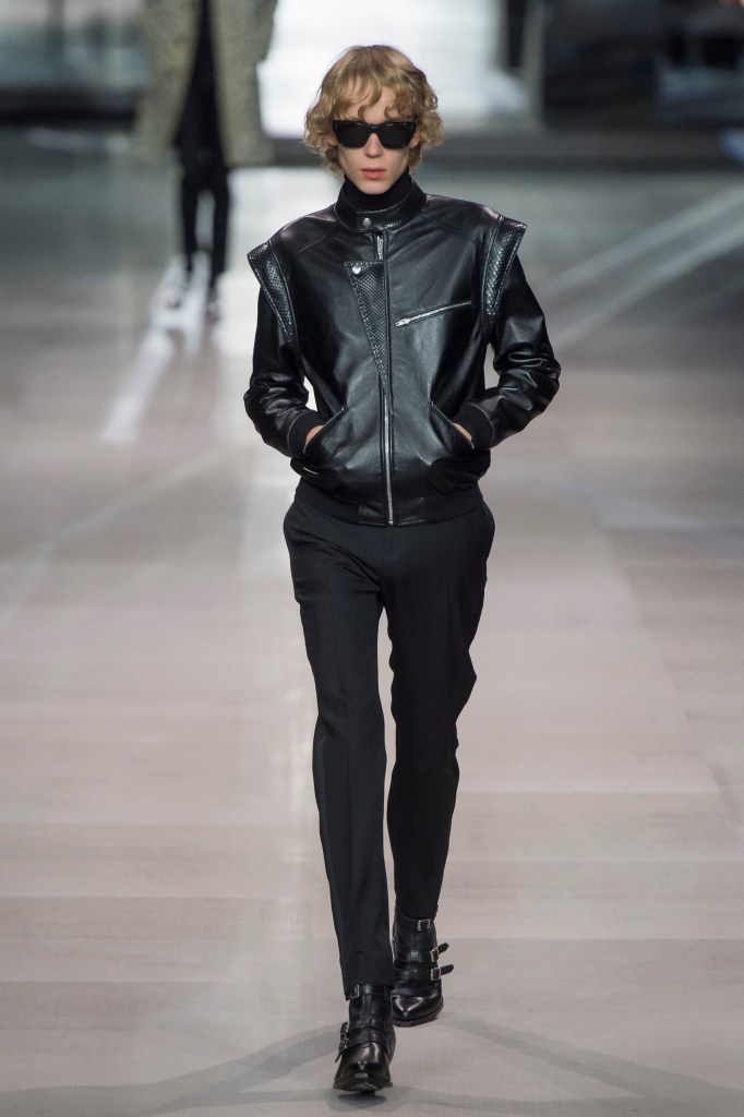 アンヴァリッドが最高に似合う金ボタンのナポレオンコート。フリルのシャツには蝶ネクタイを合わせ、ベルベットのパンツで更に上品に。CELINEに就任した後も作り続けているスモーキングは、Yves Saint Laurentへのオマージュが残っているからでしょうか。ブリティッシュの雰囲気を持つガンクラブ柄のコート。ベルテットやエポレットなどのディテールは英国を代表するトレンチコートと共通しています。こちらはかなりウィメンズのスタイルに振り切ったルック。けれども、女装しているようには思わせない。もしかして、この人アンドロジニーなのかも、?と思わせる絶妙なバランス感。テーラードといえばブリティッシュ。Hediのテーラードの肩のラインは、常にブリティッシュを象徴するコンケープド(肩先にかけて上がり、お堅い印象を与えるシルエット)になっています。デニムジャケットは、LAのグランジにはかかせない1着。スタッズをつけることで、さらにロックスターな気分に。キラキラと輝くそのスーツは、まさにロックスターそのもの。ボウタイブラウスを合わせることで、ジェンダレスを唱う現代のロックスタースタイルに。ブーツのヒールは80mm。Saint Laurent 2015awのような高さで、ほとんどウィメンズに近いシルエットになっています。ブーツは、クラシックなカーフスキンやスエードから、ロックなシルバー、ゴールド、パイソン柄など様々。スキニーなスカーフは、Dior時代から作り続けているHediの定番。ウィメンズのようなナイーブな雰囲気を出す、彼のスタイルにはかかせないアイテムです。今季は、メンズのバッグとしてショルダーバッグを提案。長年女性のものとされてきていたものを、今は男性が持つ時代なのです。