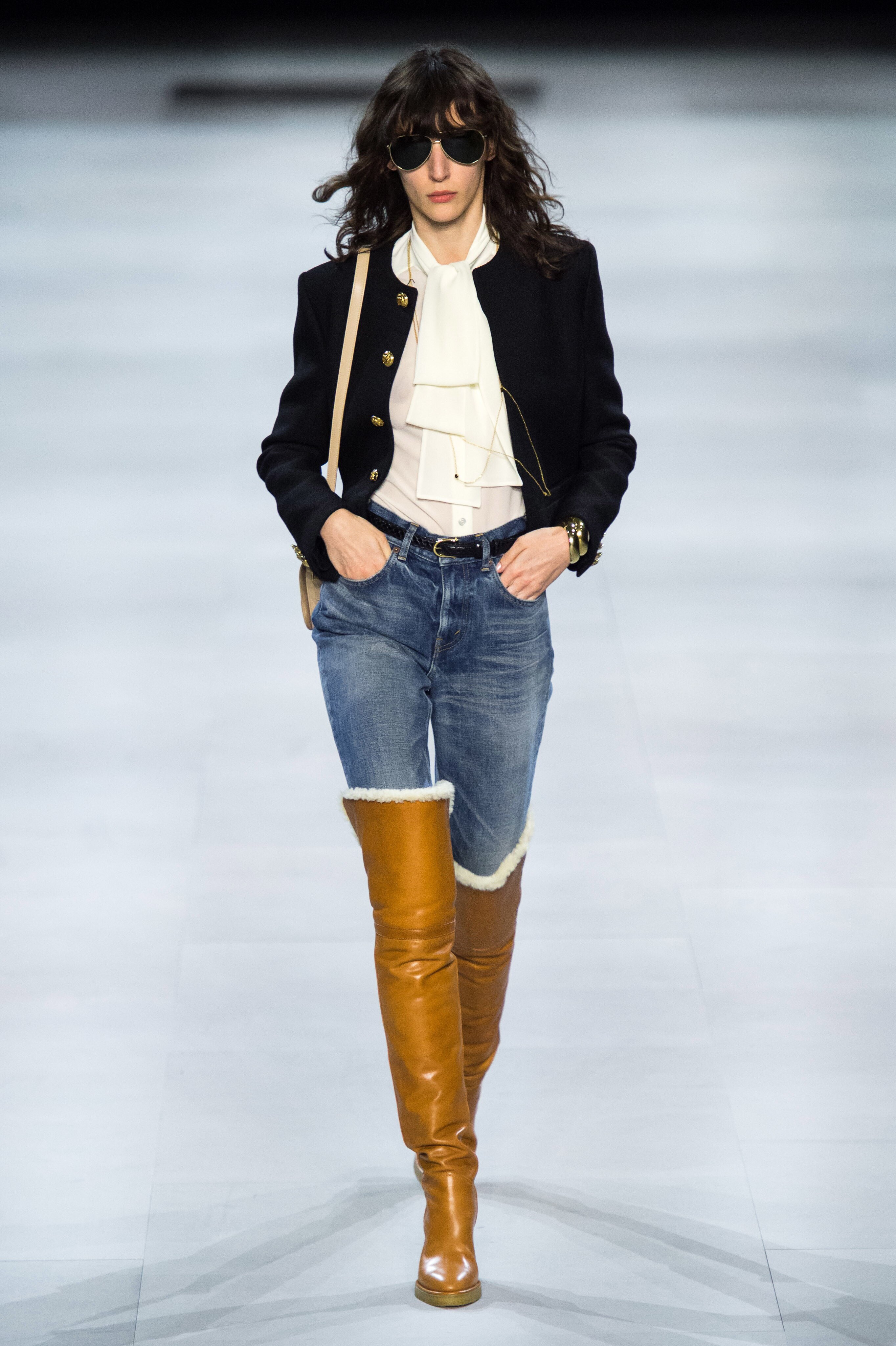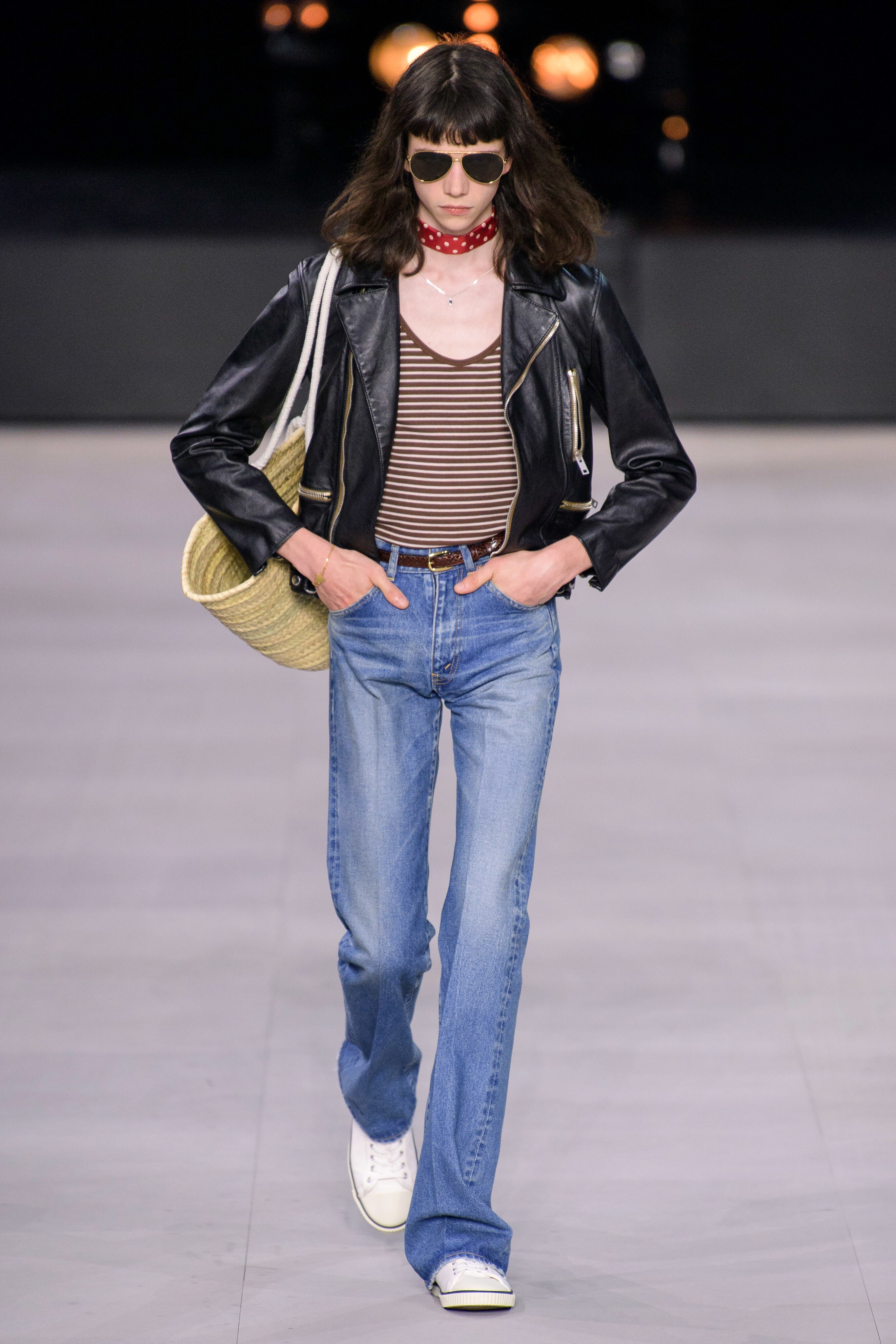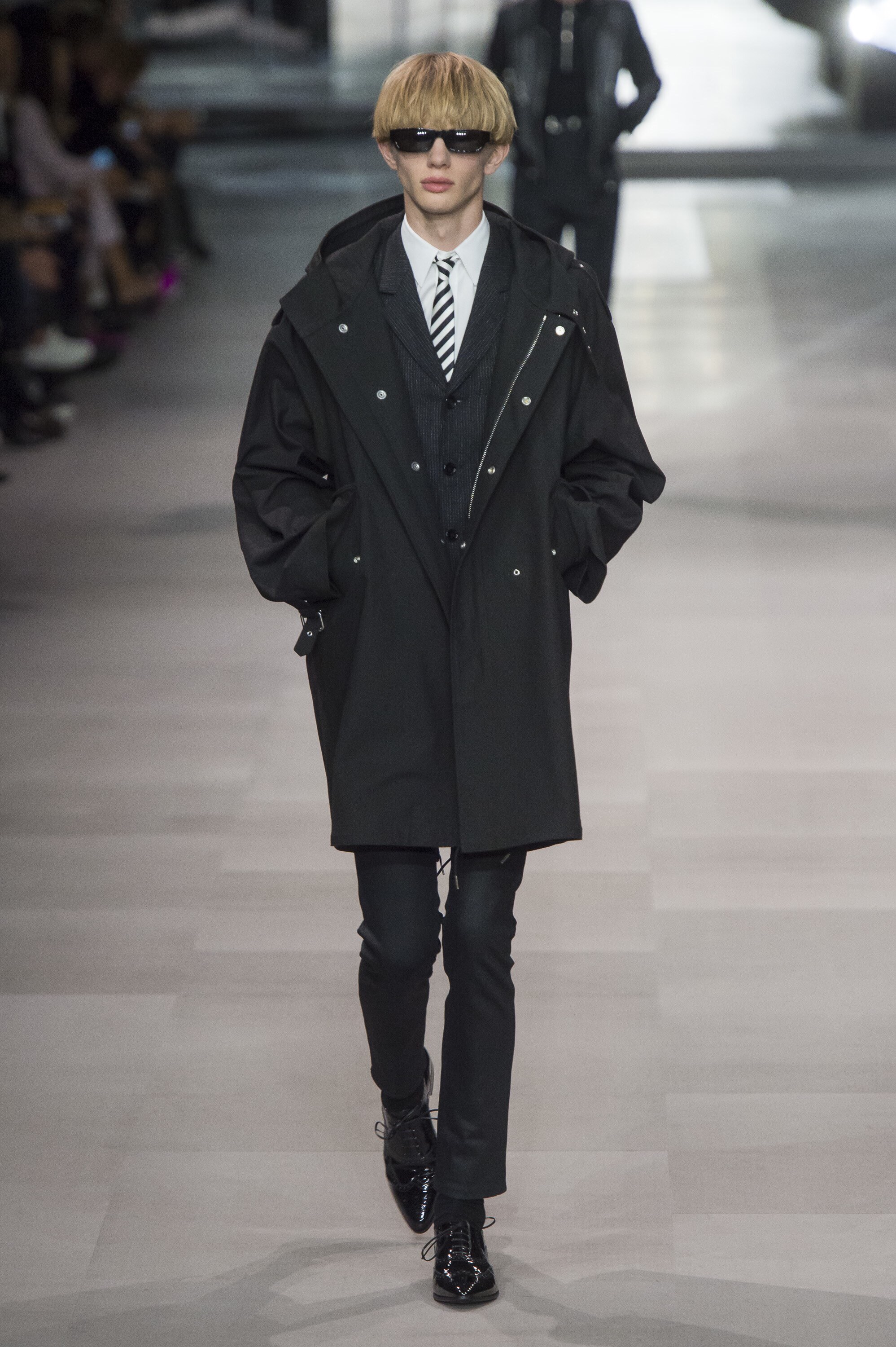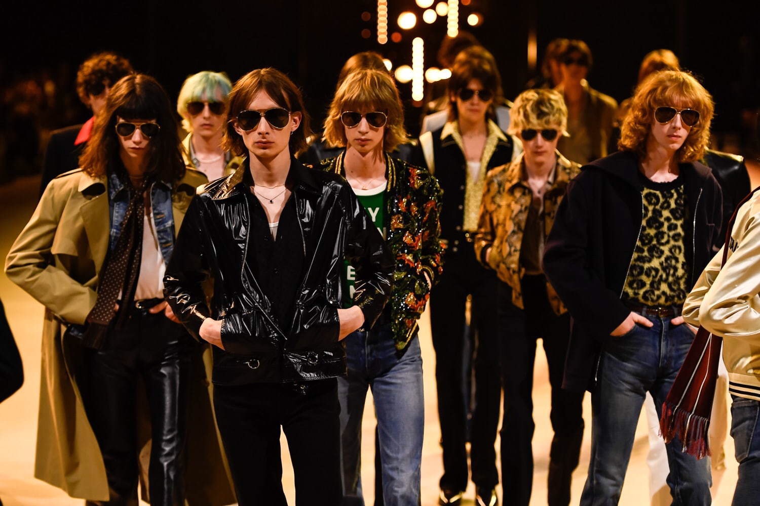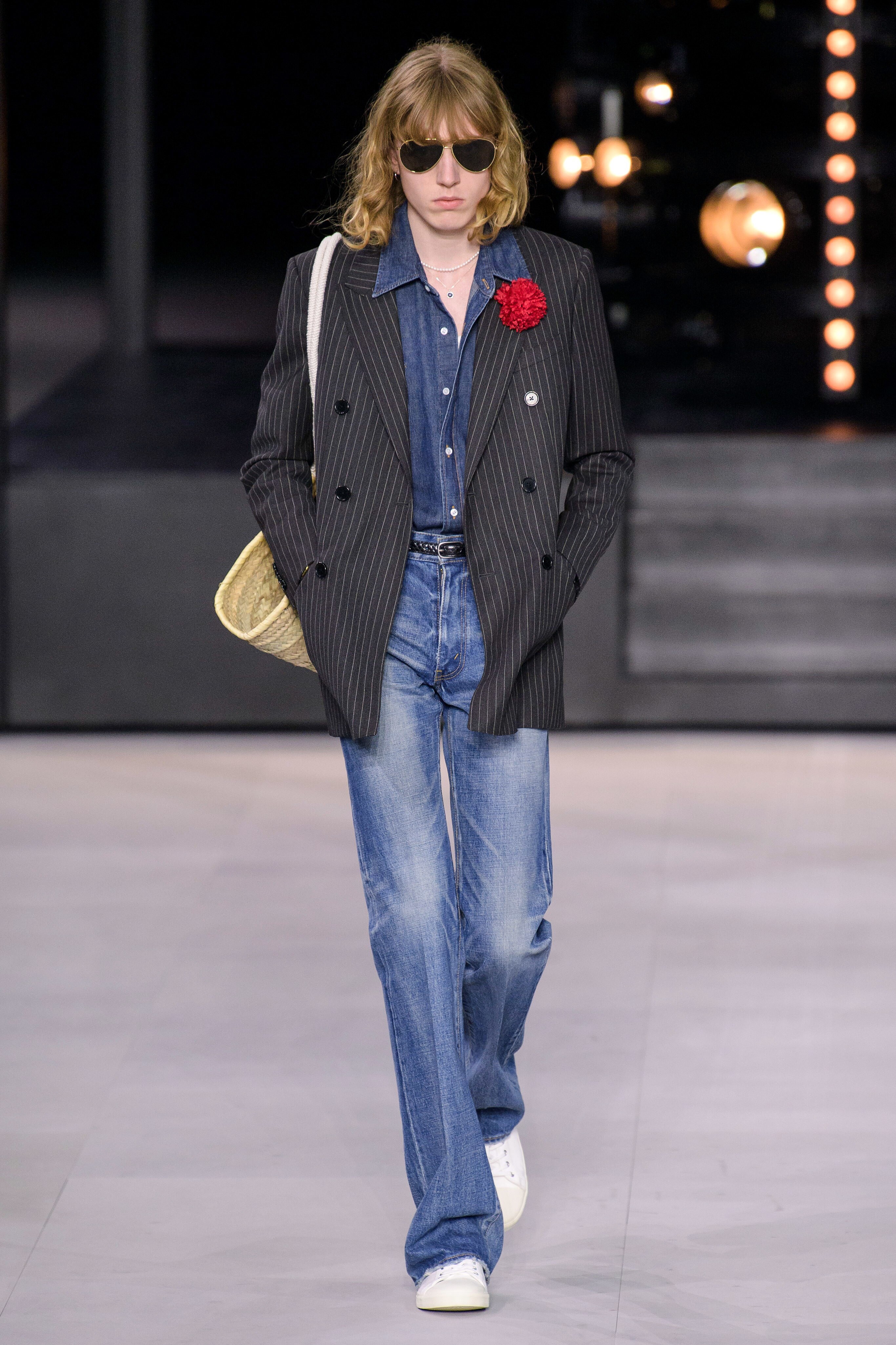アンヴァリッドが最高に似合う金ボタンのナポレオンコート。フリルのシャツには蝶ネクタイを合わせ、ベルベットのパンツで更に上品に。CELINEに就任した後も作り続けているスモーキングは、Yves Saint Laurentへのオマージュが残っているからでしょうか。ブリティッシュの雰囲気を持つガンクラブ柄のコート。ベルテットやエポレットなどのディテールは英国を代表するトレンチコートと共通しています。こちらはかなりウィメンズのスタイルに振り切ったルック。けれども、女装しているようには思わせない。もしかして、この人アンドロジニーなのかも、?と思わせる絶妙なバランス感。テーラードといえばブリティッシュ。Hediのテーラードの肩のラインは、常にブリティッシュを象徴するコンケープド(肩先にかけて上がり、お堅い印象を与えるシルエット)になっています。デニムジャケットは、LAのグランジにはかかせない1着。スタッズをつけることで、さらにロックスターな気分に。キラキラと輝くそのスーツは、まさにロックスターそのもの。ボウタイブラウスを合わせることで、ジェンダレスを唱う現代のロックスタースタイルに。ブーツのヒールは80mm。Saint Laurent 2015awのような高さで、ほとんどウィメンズに近いシルエットになっています。ブーツは、クラシックなカーフスキンやスエードから、ロックなシルバー、ゴールド、パイソン柄など様々。スキニーなスカーフは、Dior時代から作り続けているHediの定番。ウィメンズのようなナイーブな雰囲気を出す、彼のスタイルにはかかせないアイテムです。今季は、メンズのバッグとしてショルダーバッグを提案。長年女性のものとされてきていたものを、今は男性が持つ時代なのです。