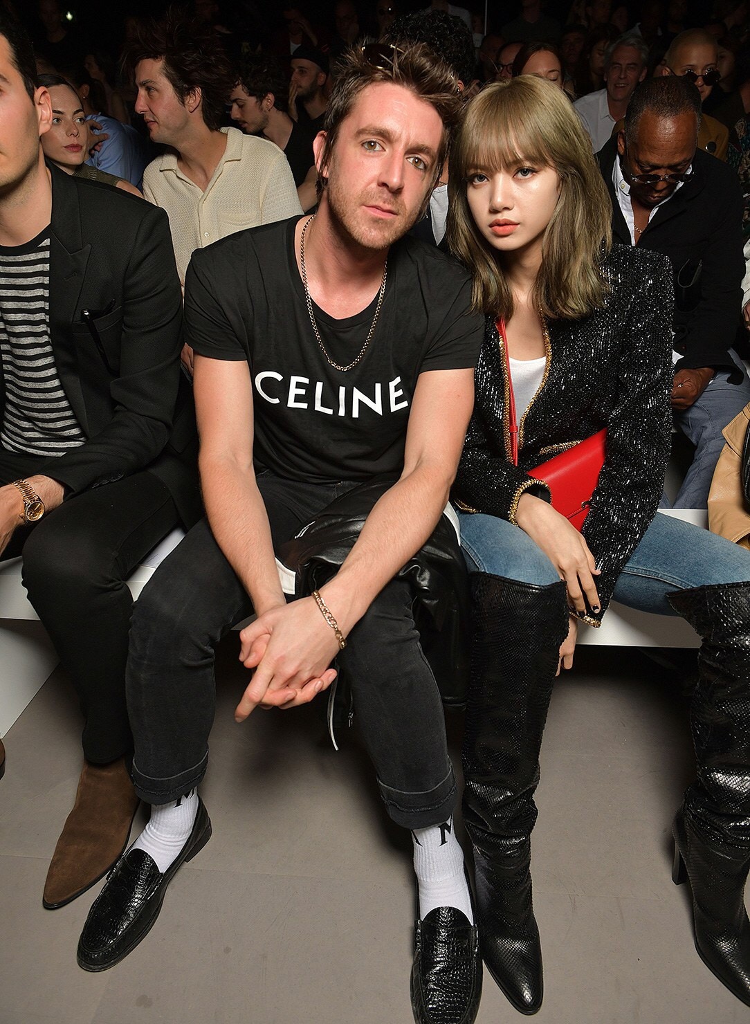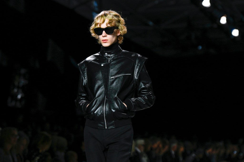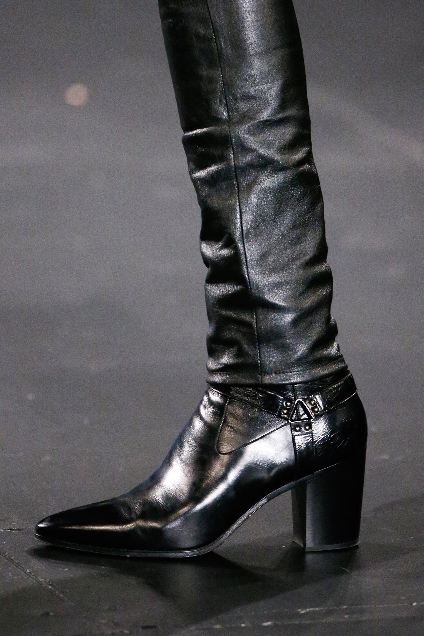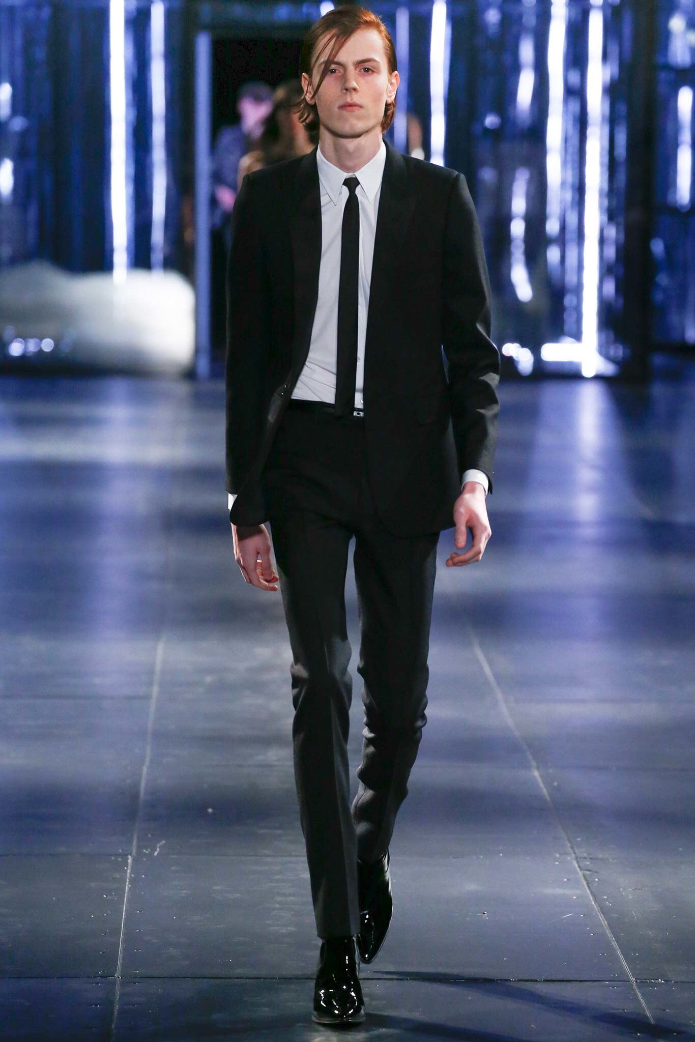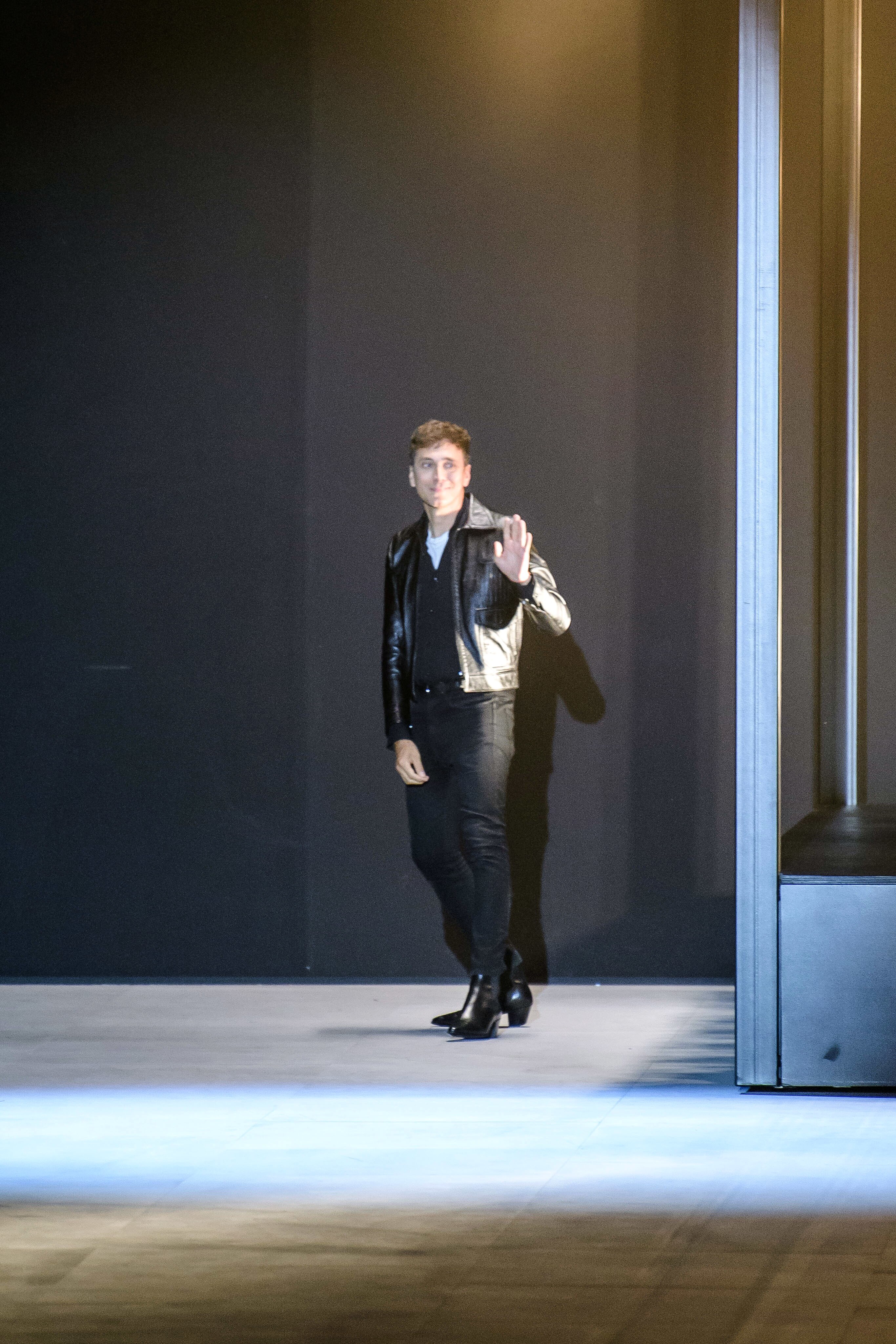 アンヴァリッドが最高に似合う金ボタンのナポレオンコート。フリルのシャツには蝶ネクタイを合わせ、ベルベットのパンツで更に上品に。CELINEに就任した後も作り続けているスモーキングは、Yves Saint Laurentへのオマージュが残っているからでしょうか。ブリティッシュの雰囲気を持つガンクラブ柄のコート。ベルテットやエポレットなどのディテールは英国を代表するトレンチコートと共通しています。こちらはかなりウィメンズのスタイルに振り切ったルック。けれども、女装しているようには思わせない。もしかして、この人アンドロジニーなのかも、?と思わせる絶妙なバランス感。テーラードといえばブリティッシュ。Hediのテーラードの肩のラインは、常にブリティッシュを象徴するコンケープド(肩先にかけて上がり、お堅い印象を与えるシルエット)になっています。デニムジャケットは、LAのグランジにはかかせない1着。スタッズをつけることで、さらにロックスターな気分に。キラキラと輝くそのスーツは、まさにロックスターそのもの。ボウタイブラウスを合わせることで、ジェンダレスを唱う現代のロックスタースタイルに。ブーツのヒールは80mm。Saint Laurent 2015awのような高さで、ほとんどウィメンズに近いシルエットになっています。ブーツは、クラシックなカーフスキンやスエードから、ロックなシルバー、ゴールド、パイソン柄など様々。スキニーなスカーフは、Dior時代から作り続けているHediの定番。ウィメンズのようなナイーブな雰囲気を出す、彼のスタイルにはかかせないアイテムです。今季は、メンズのバッグとしてショルダーバッグを提案。長年女性のものとされてきていたものを、今は男性が持つ時代なのです。
