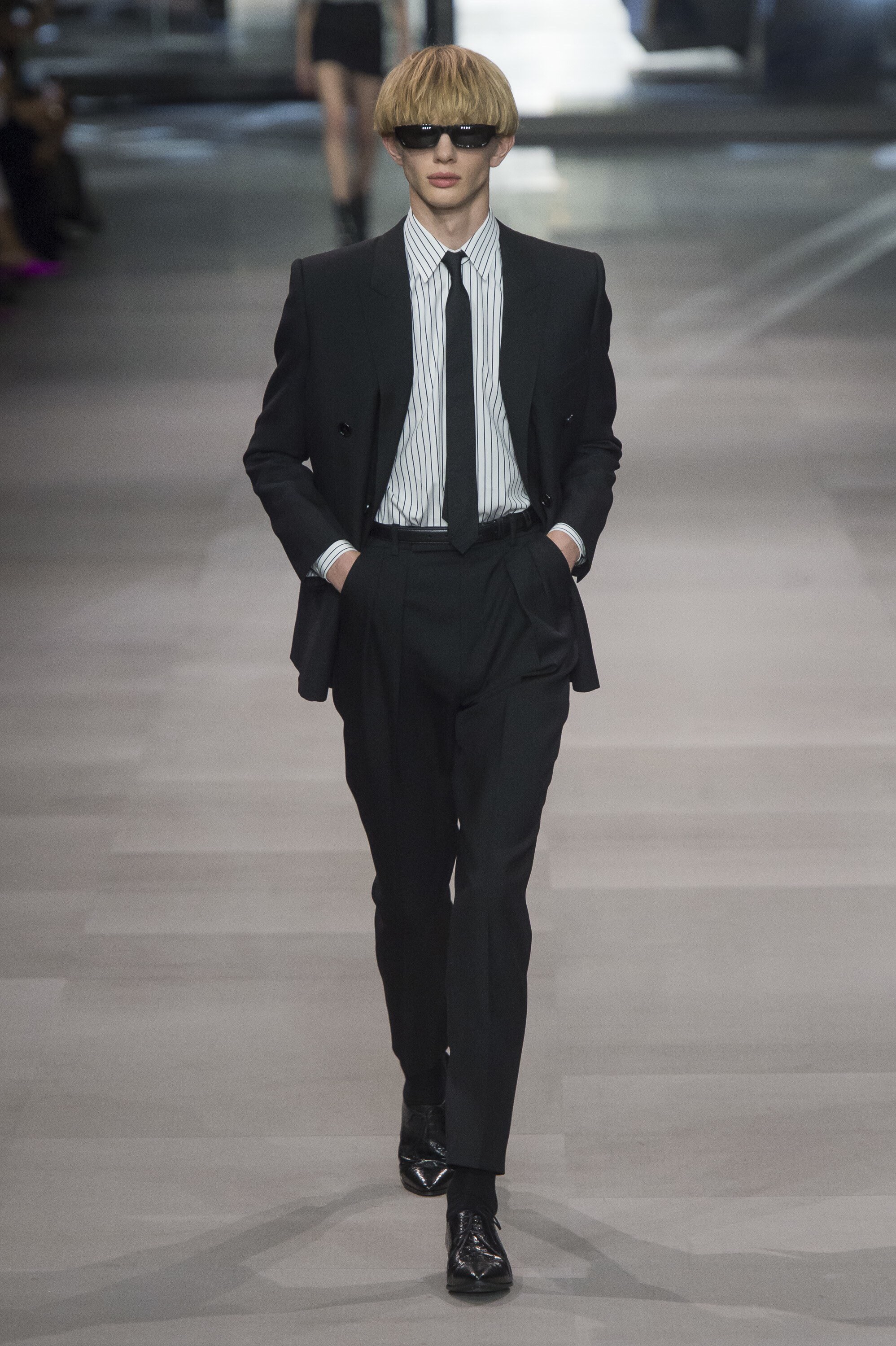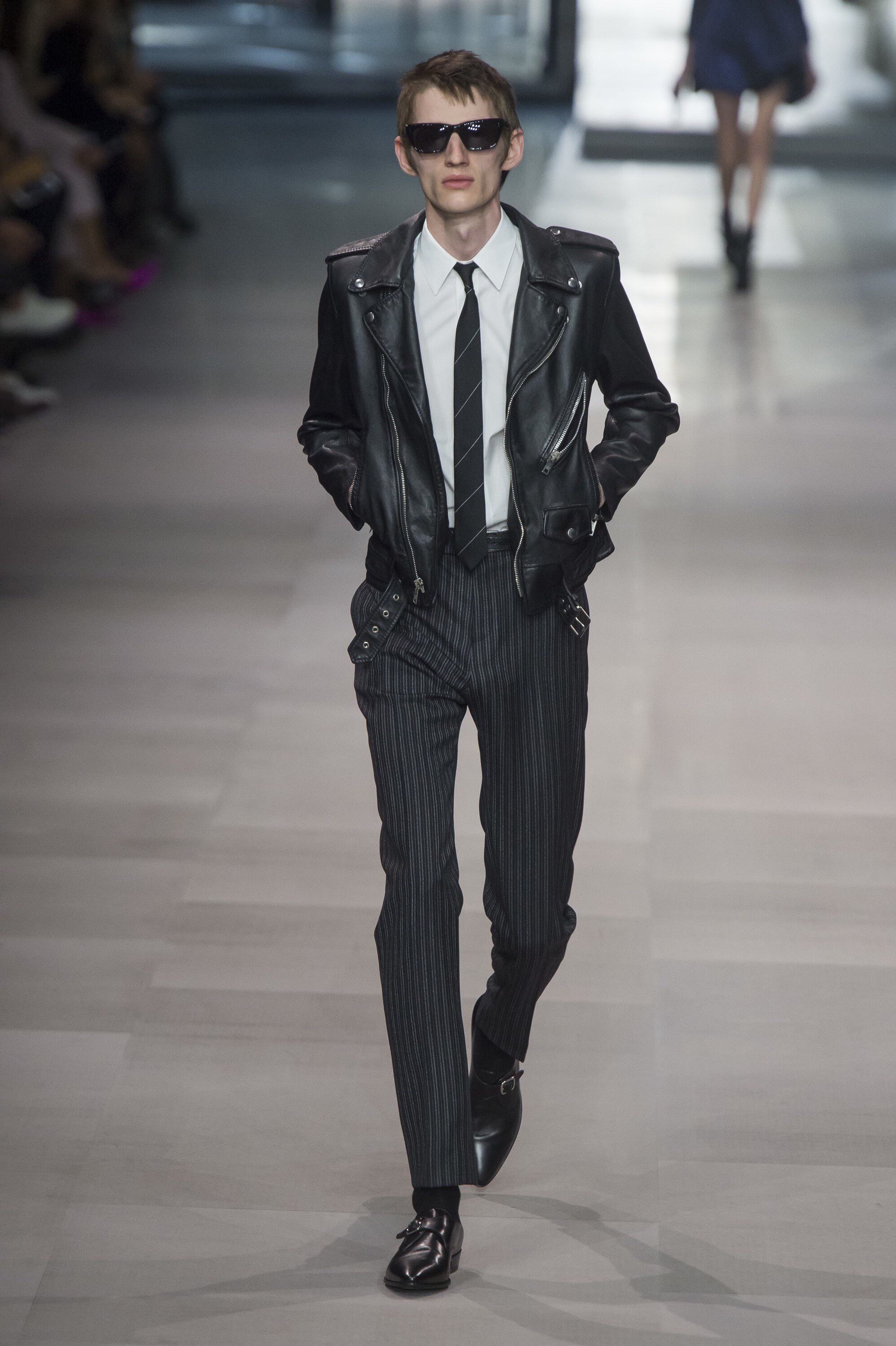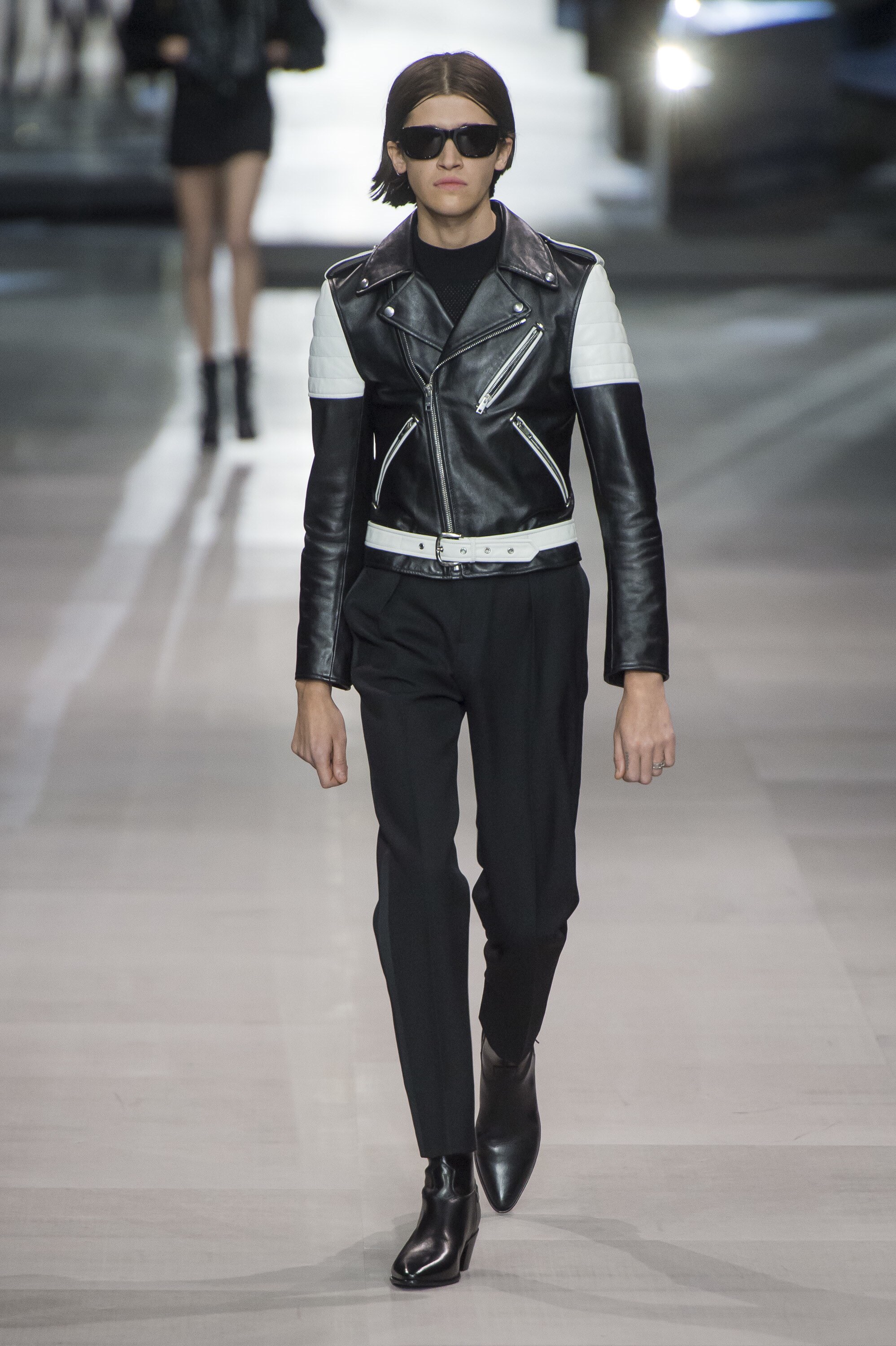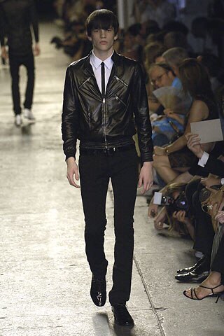 これはメンズのファーストシーズンのファーストルック。Monsieur Yves Saint Laurentが、自身の最高傑作だと言っていたスモーキング(タキシード)を現代風に解釈してファーストルックでボンバイヤですよ。ブランドを重んじながら彼の世界観を体現してます。素晴らしいバランス感。このシーズンに数多くの名作が生まれましたね。このライダース、黒スキニーパンツ、ブーツは今もSaint Laurentの定番として受け継がれています。これを超すシルエットは存在しません。しません。